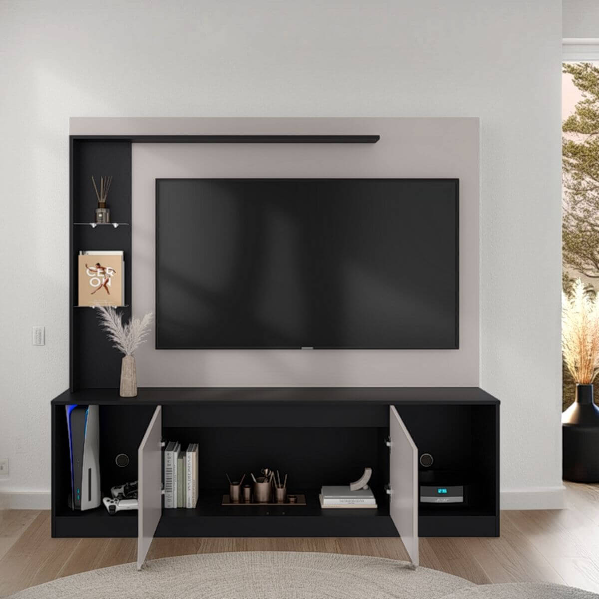 Centro de entretenimiento moderno, con espacio para objetos decorativos, de audio y video, 2 puertas abatibles y con espacio para tv de hasta 65″.