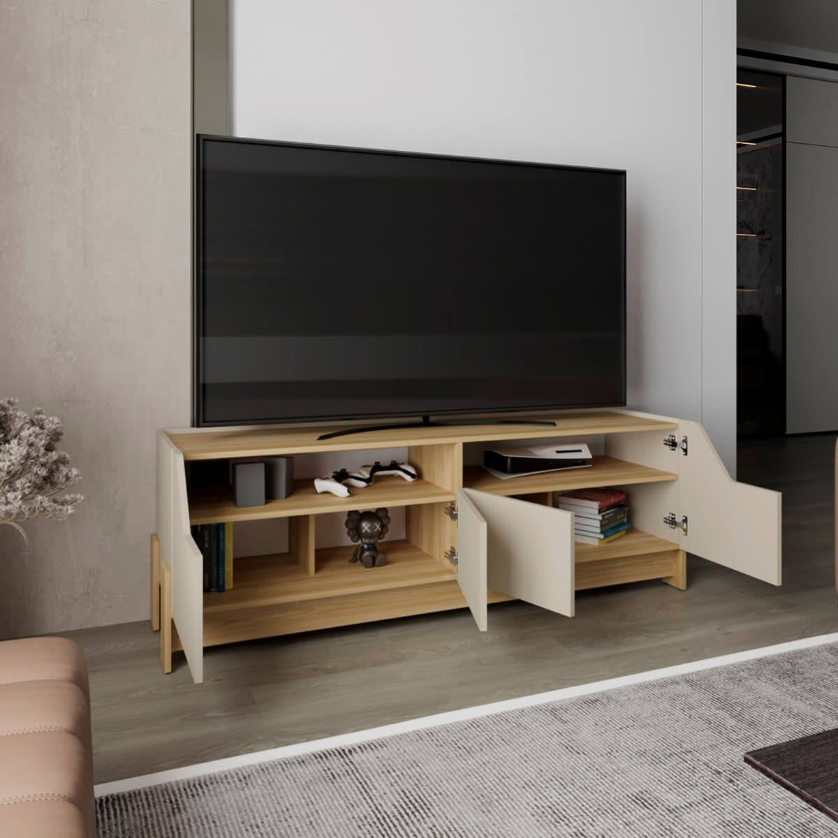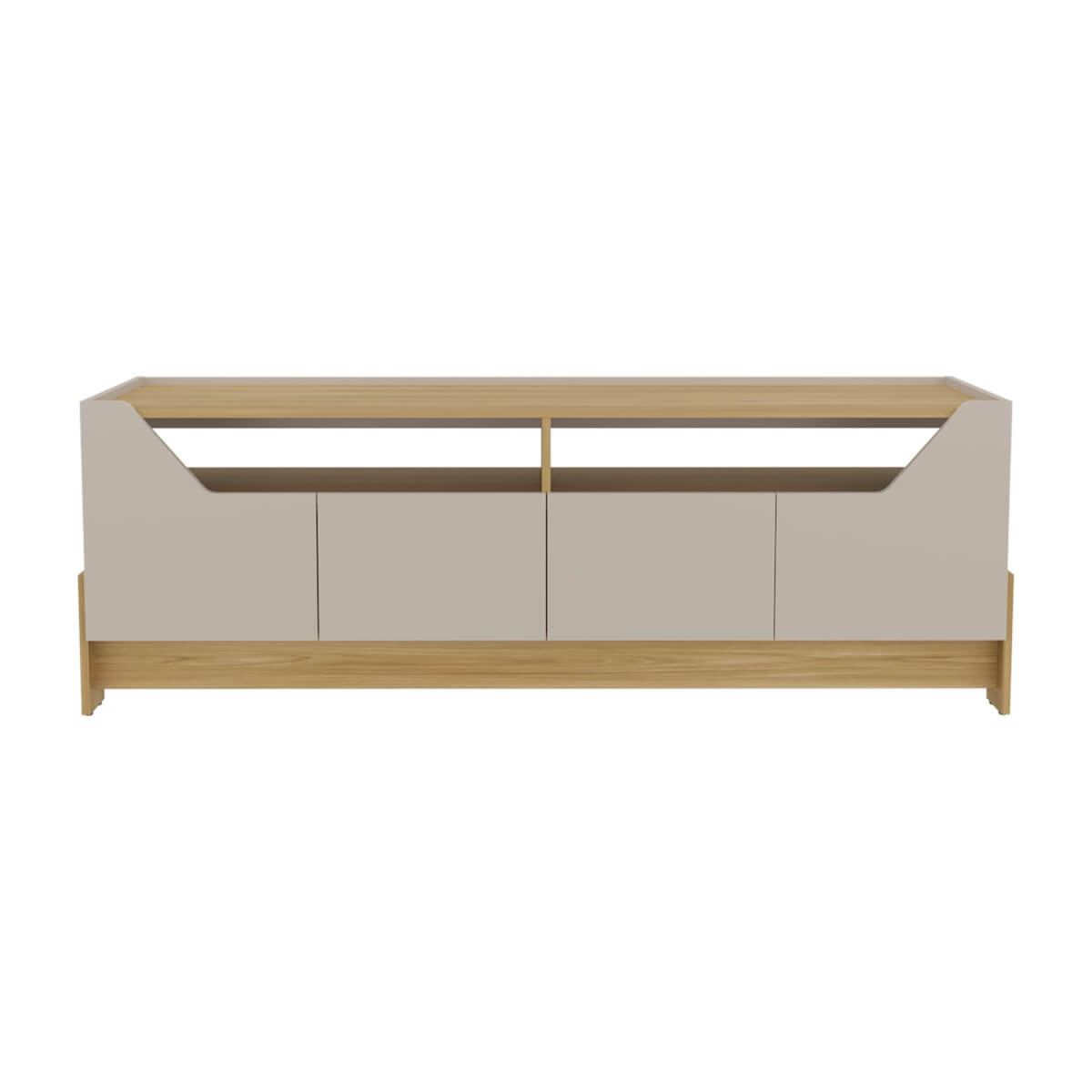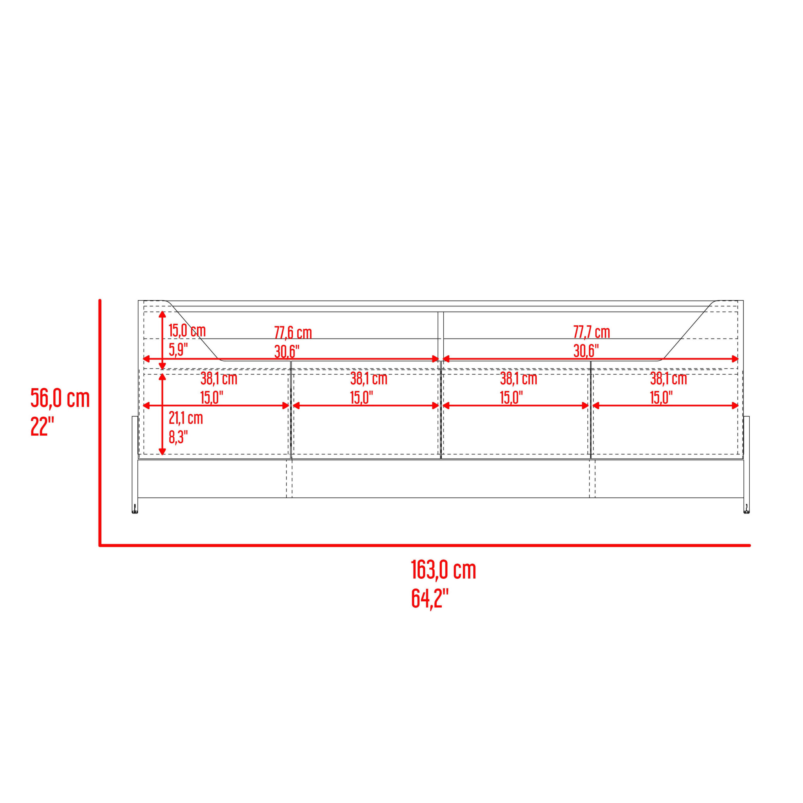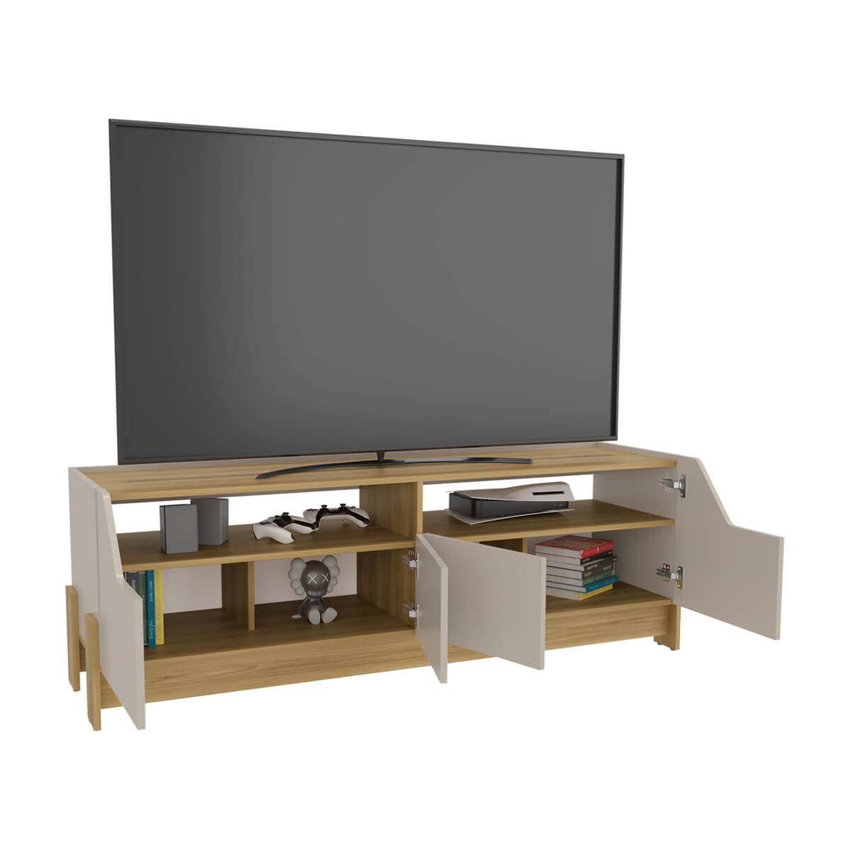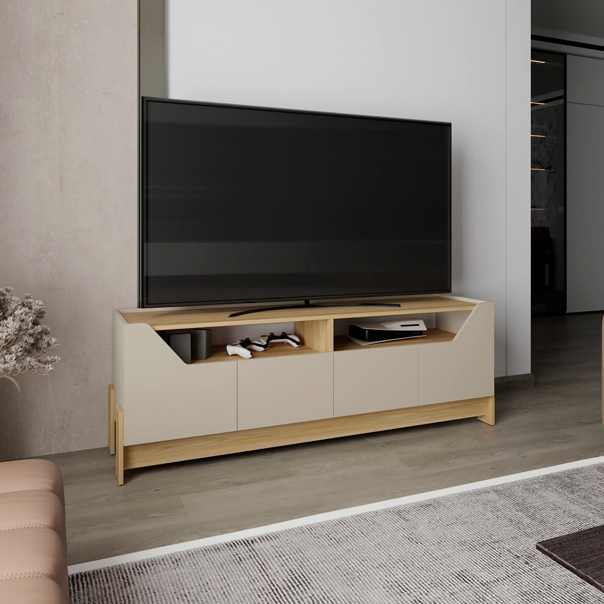 Mueble para TV con espacio para televisor de hasta 50 pulgadas, 4 puertas abatíbles, y superficie para objetos decorativos.