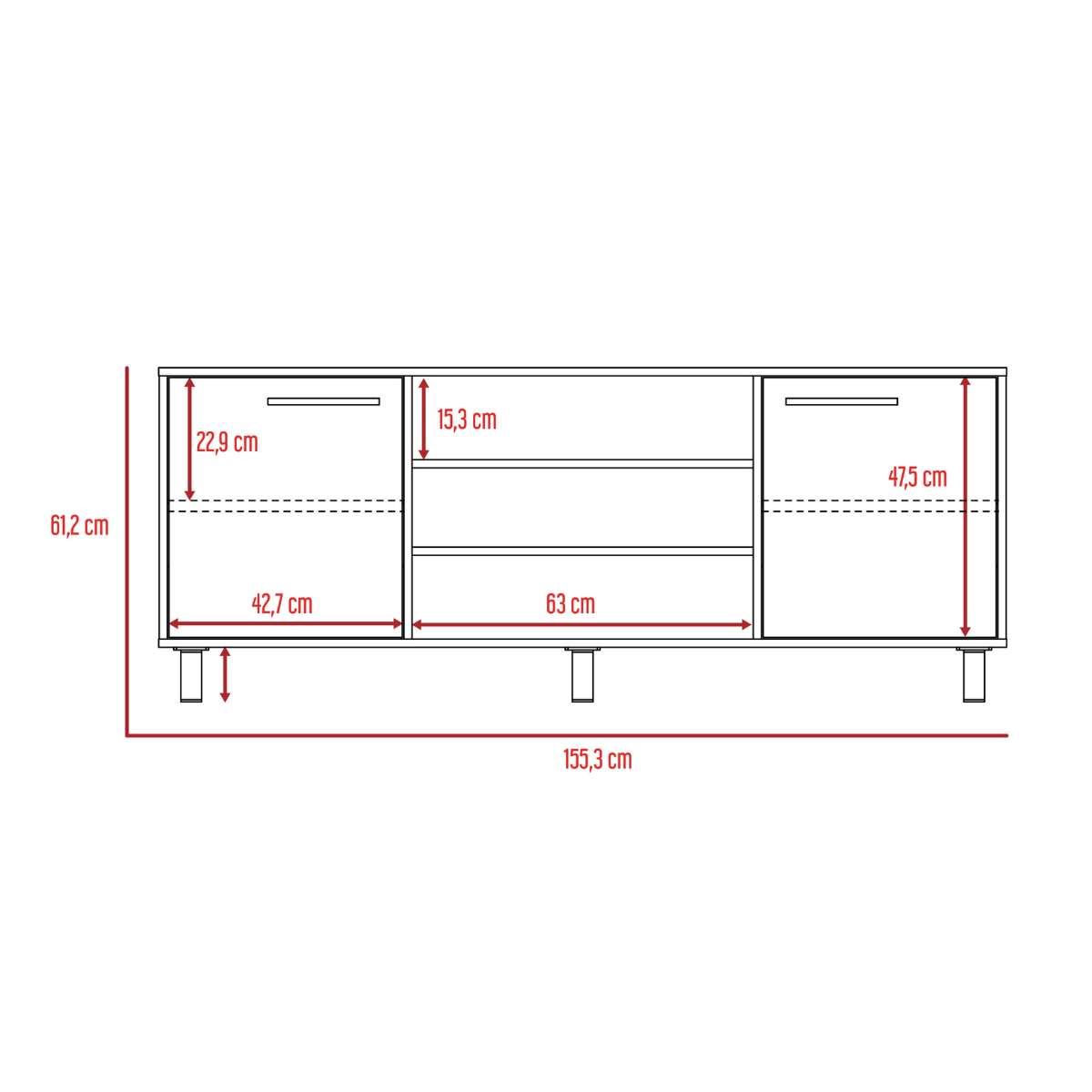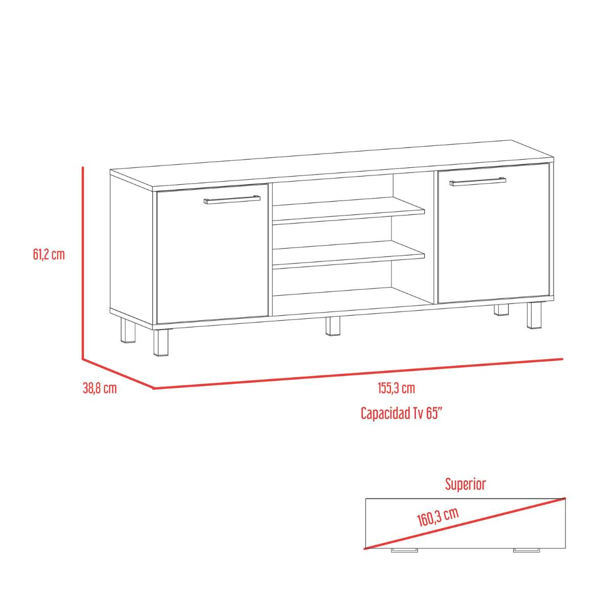 • Dimensiones (alto x ancho x profundo en cm): 61,2 x 155,5 x 38,8