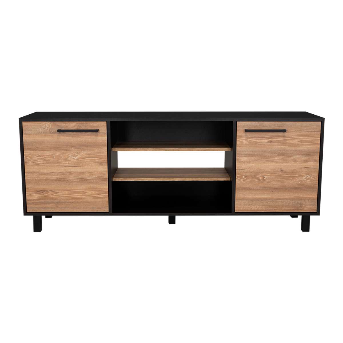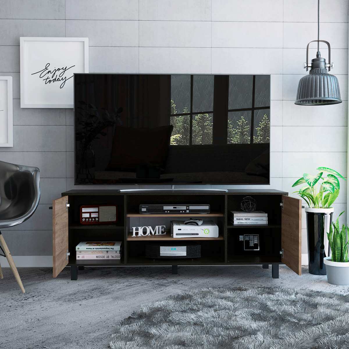 Espacio para tv de hasta 65″, patas en acero, espacios inferiores para colocar objetos decorativos y equipos de audio y video.