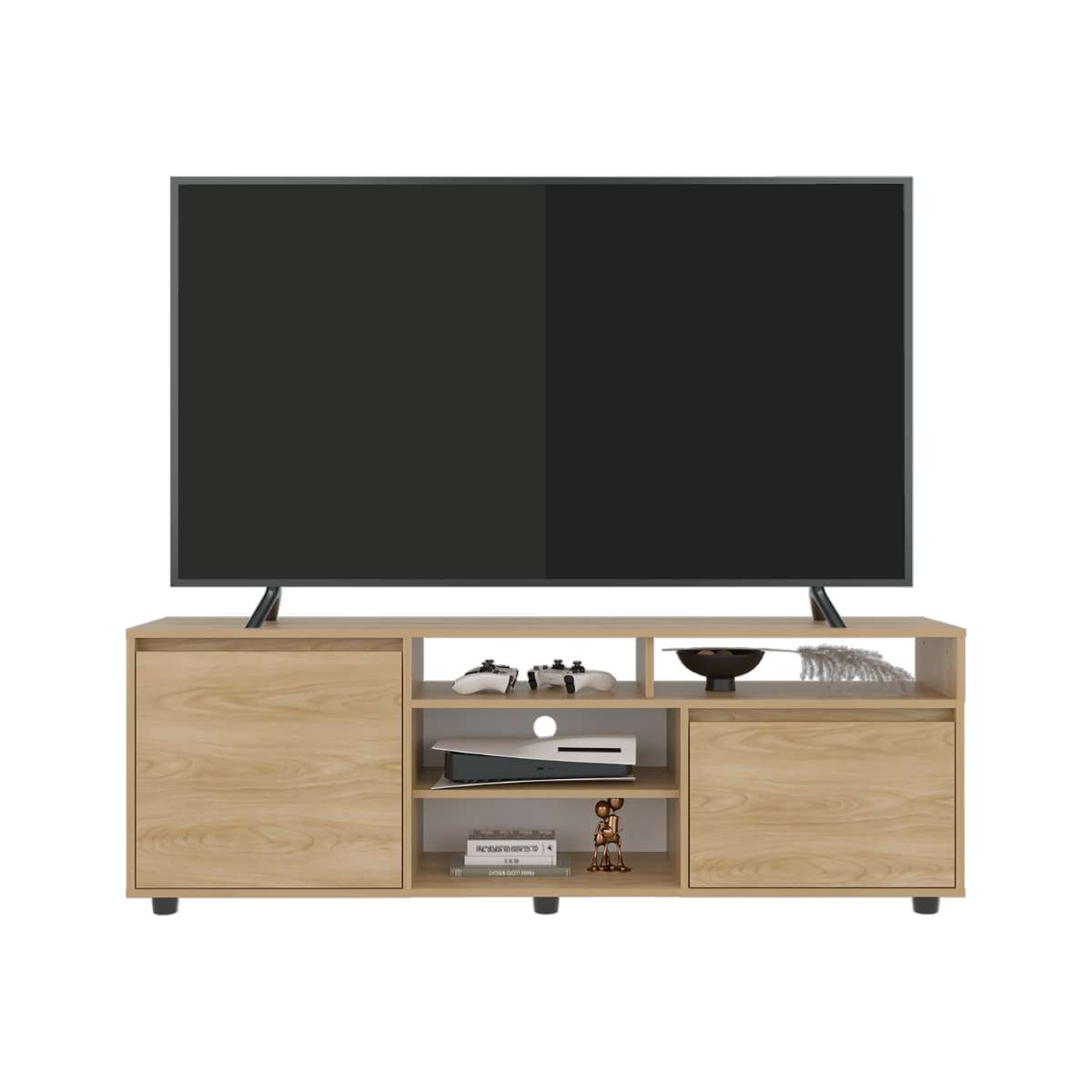 Rack para tv moderno, con superficie para objetos decorativos, equipo de audio y video, 2 puertas abatíbles, capacidad de tv hasta 65 pulgadas, es de fácil instalación.
