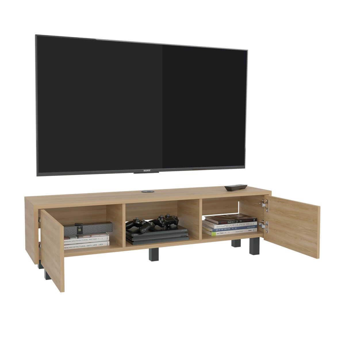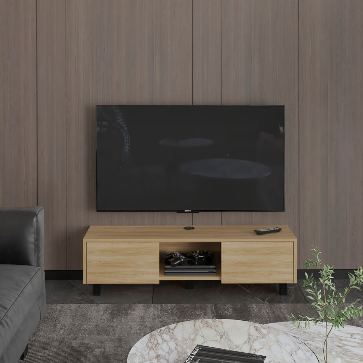 Repisa con superficie para objetos decorativos y equipos de audio y video, dos puertas abatibles, fácil de ensamblar e instalar.