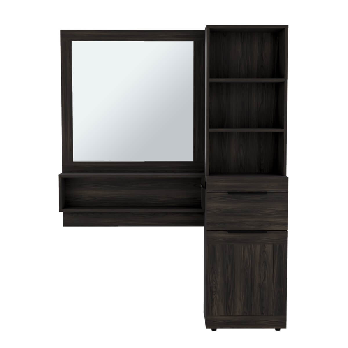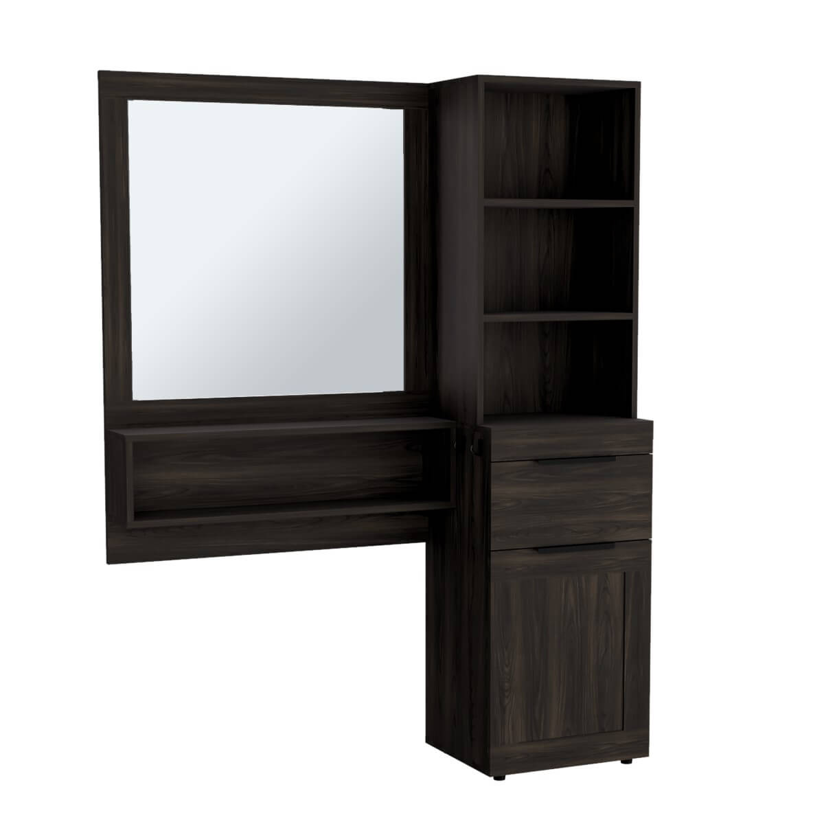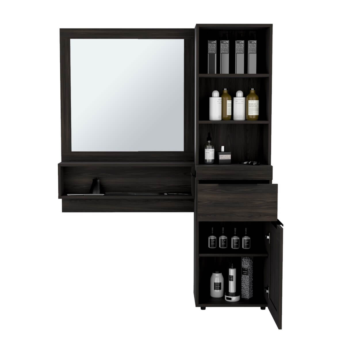 Mueble barberia con un cajón, diseño moderno, una puerta y espacios para guardar objetos.